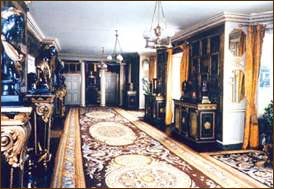 This room was added by Lord Rivers in about 1745. The prints edged in gold beading were added around 1795 and the gold leaf about a century later, in the time of the 3rd Duke. The prints are mainly of Shakespearean scenes, but there are also a number of contemporary portraits. The 1st Duke was so taken with this form of decoration, he used it in several other rooms of the house. The furniture, in the manner of Boulle, was bought by the 1st Duke in Paris in 1817. The carpets were designed for the room by the 7th Duke and woven in Madrid in 1952.